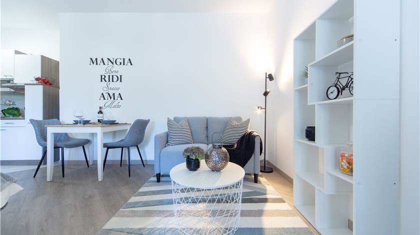 The flat is approximately 50 square metres and consists of an entrance hall, which leads directly to a corridor with a very useful built-in wardrobe. The living/sleeping area is very spacious with a kitchenette and access to a private balcony, from which you can enjoy an interesting view of the lake.